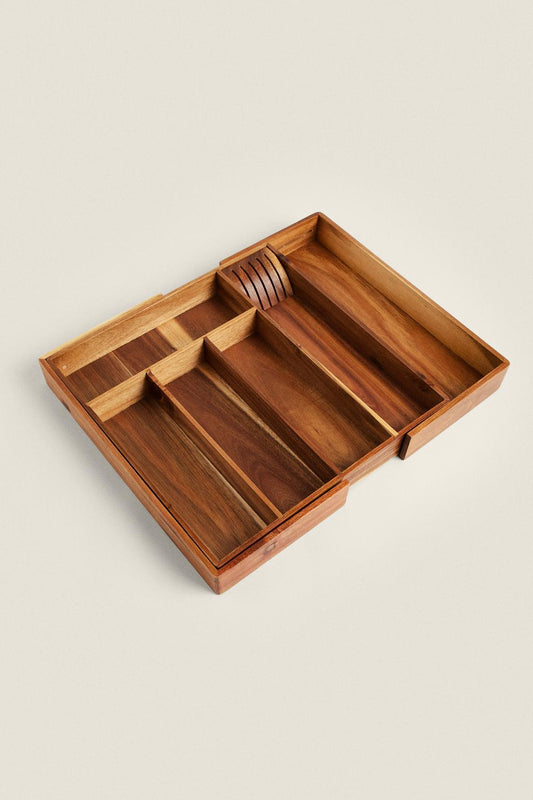 Drawer organization, expandable flatware acacia tray