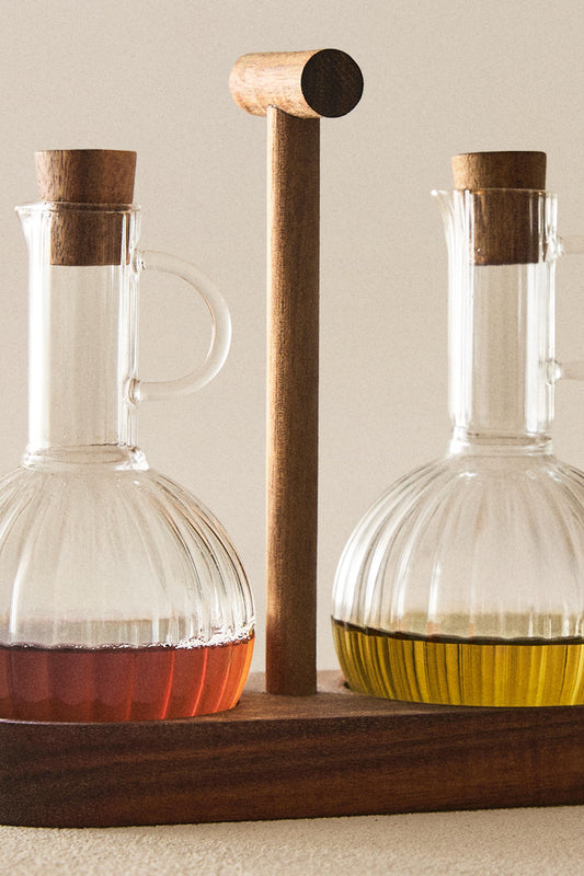 Cruet, set of borosilicate cruet with acacia base