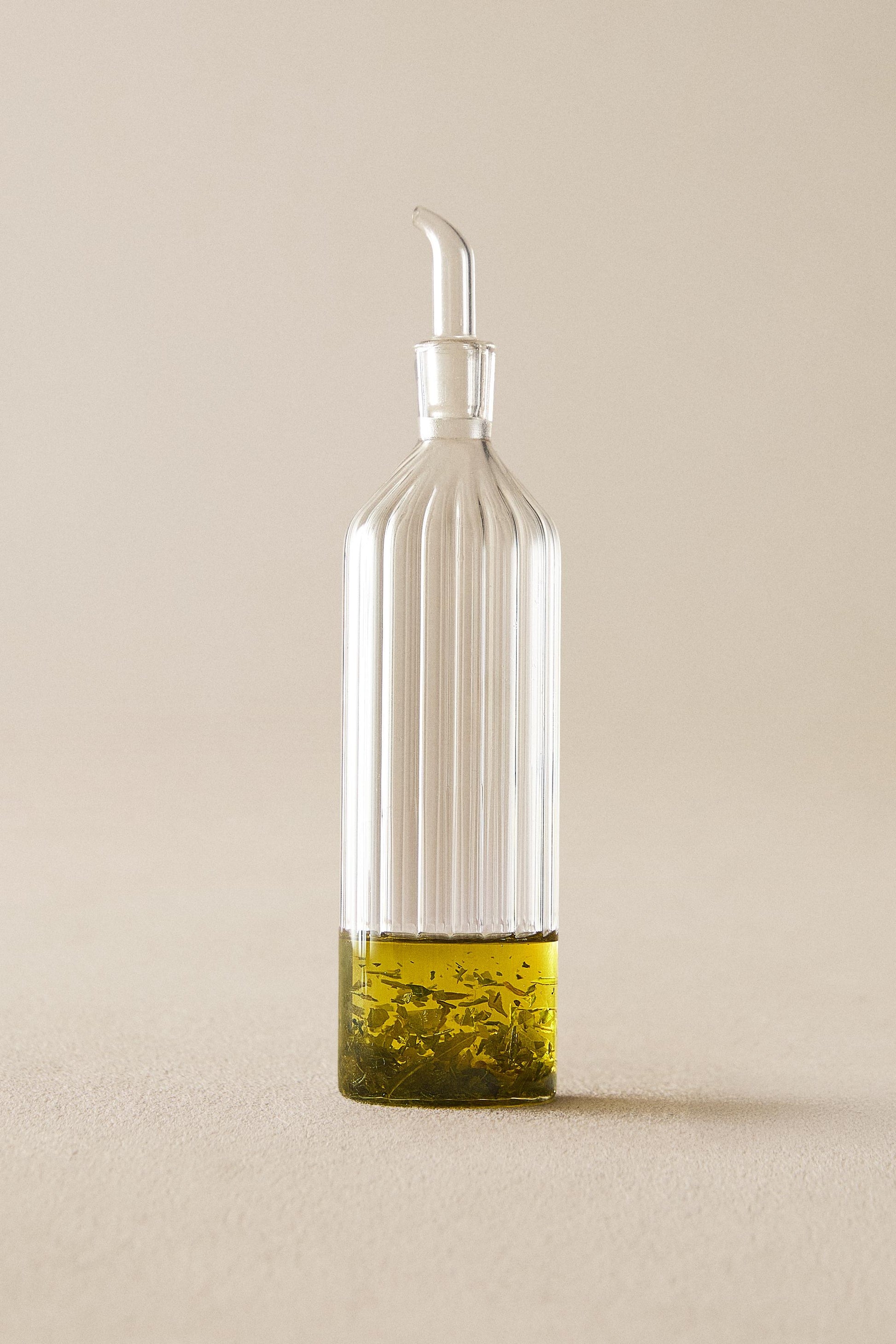 Round borosilicate glass oil/vinegar cruet with raised detail. 7.9 x 2 x 7.9 " (Height x Width x Depth).