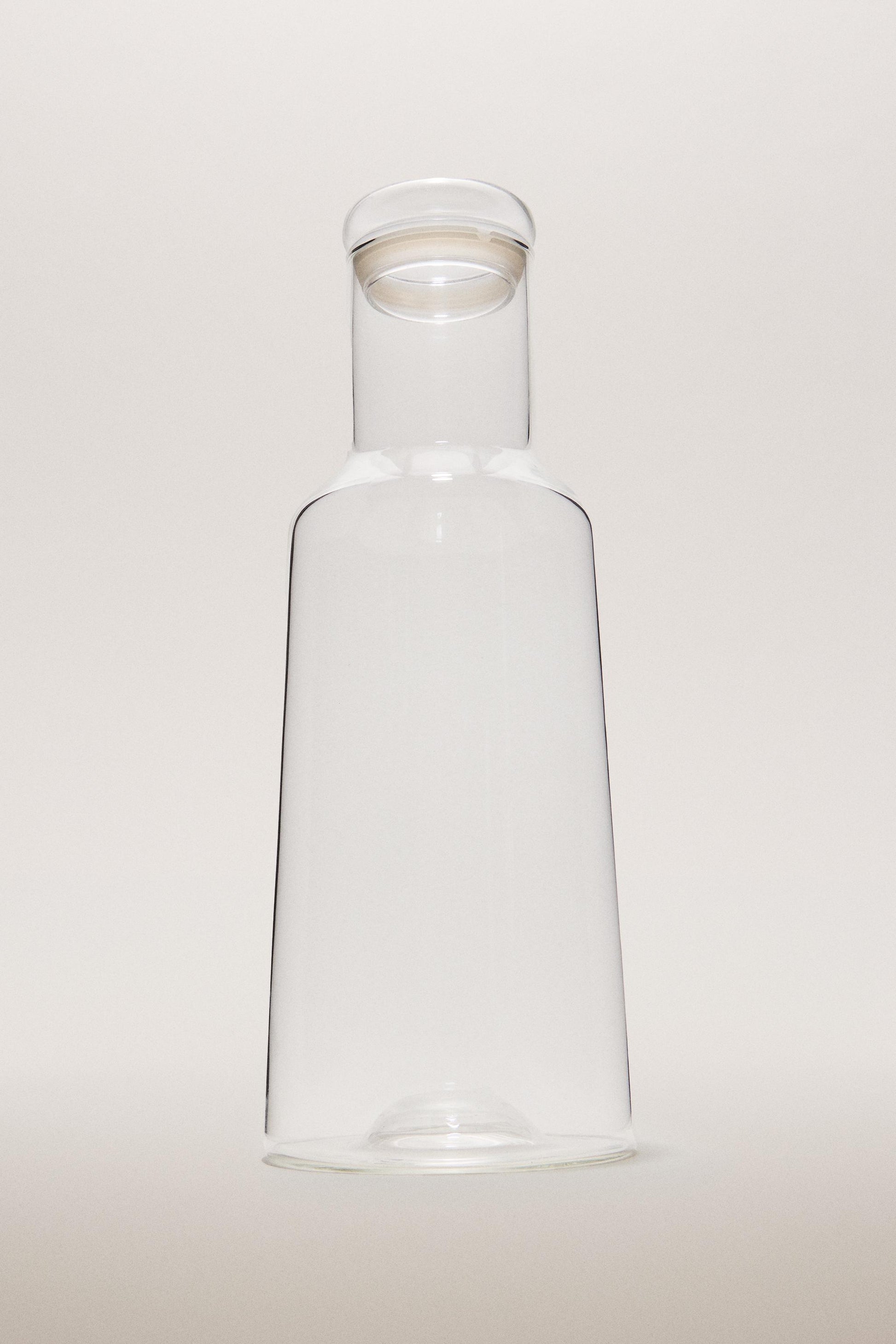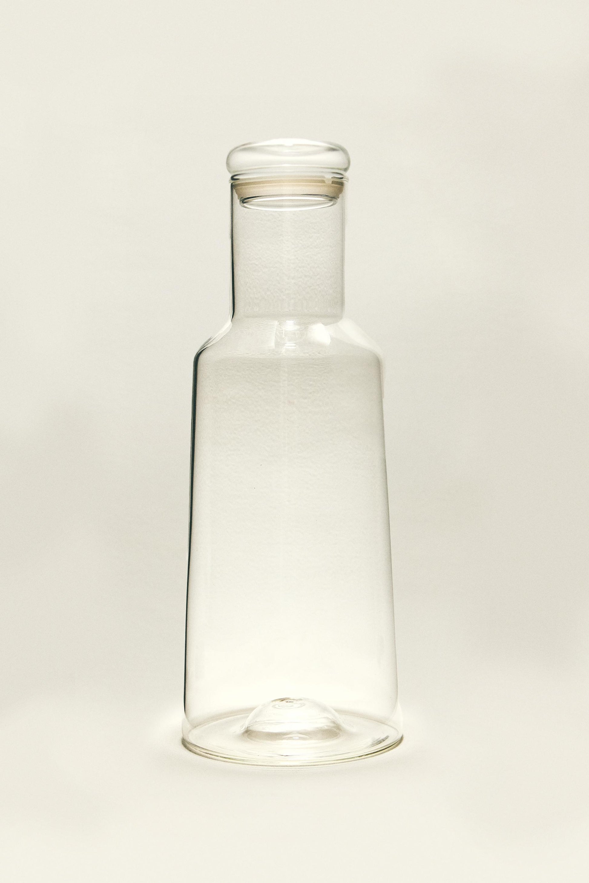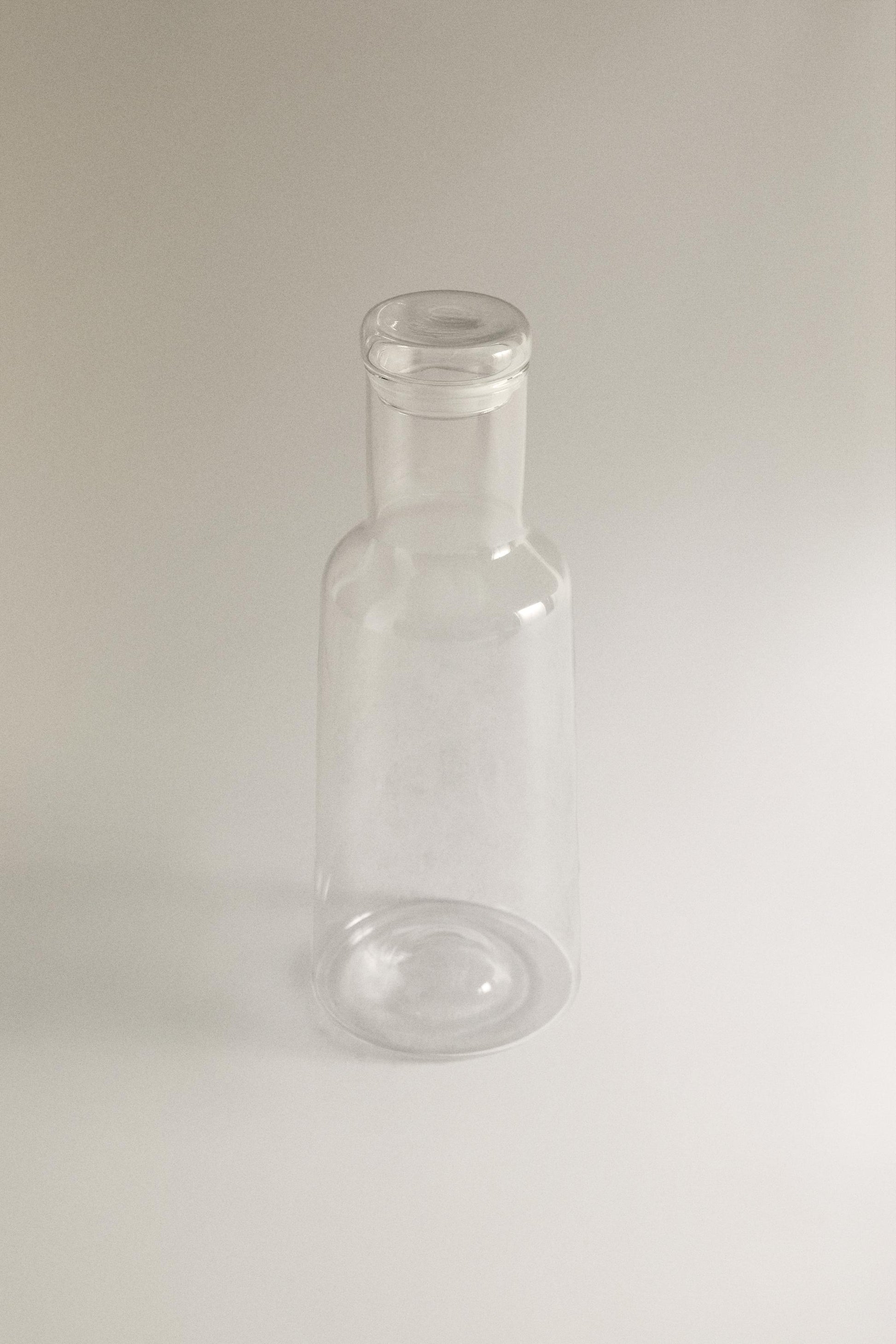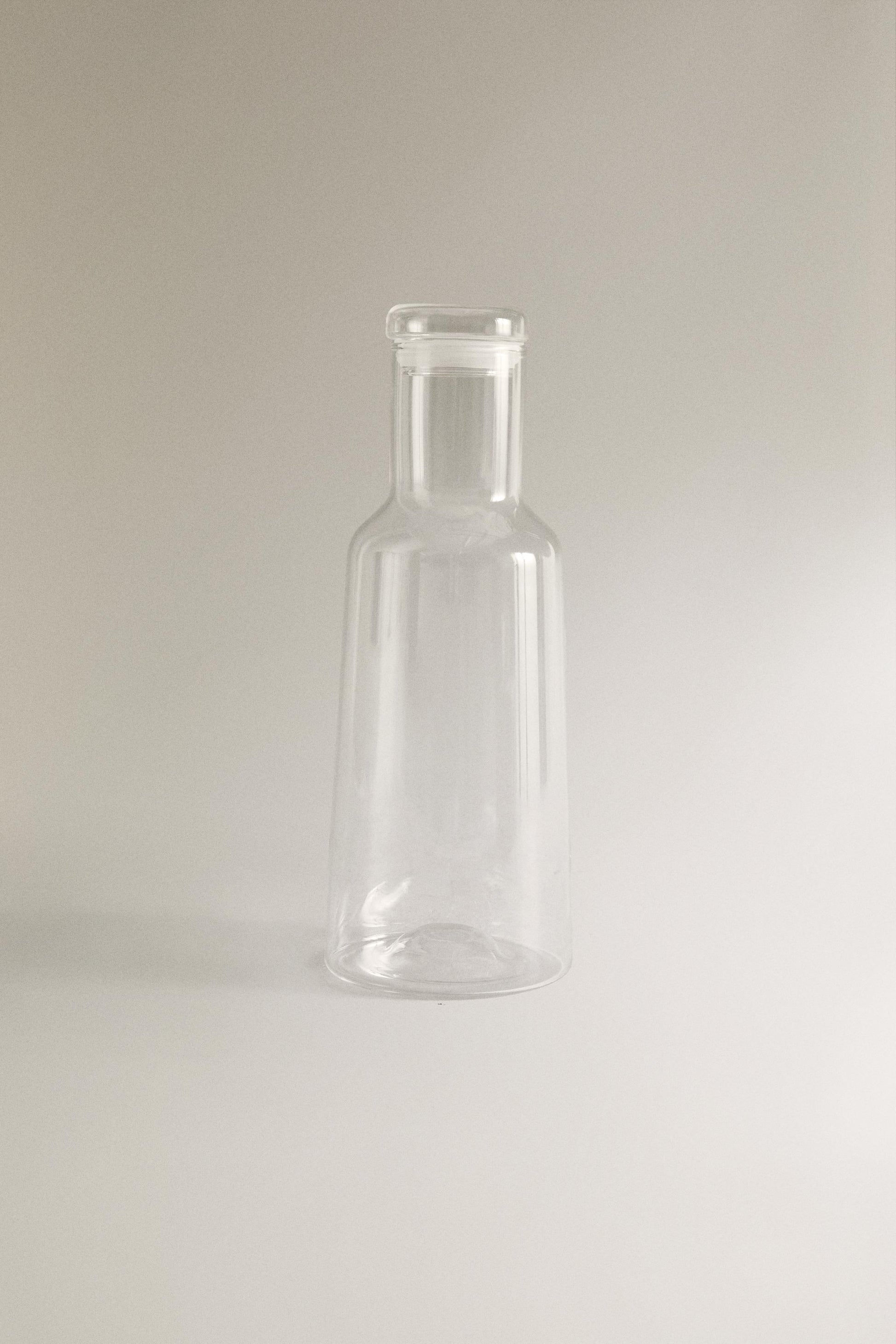 Borosilicate glass bottle with lid in a plain design. 9.8 x 3.5 x 3.5 " (Height x Width x Depth).