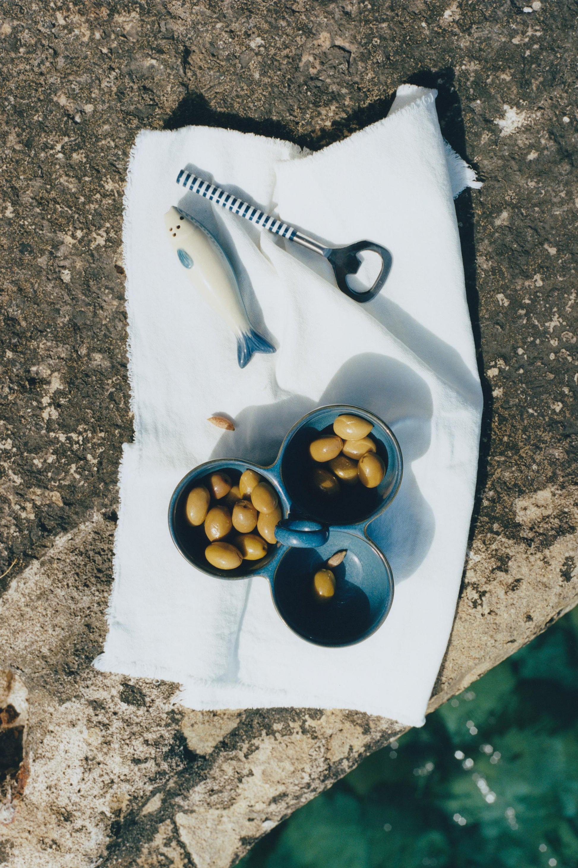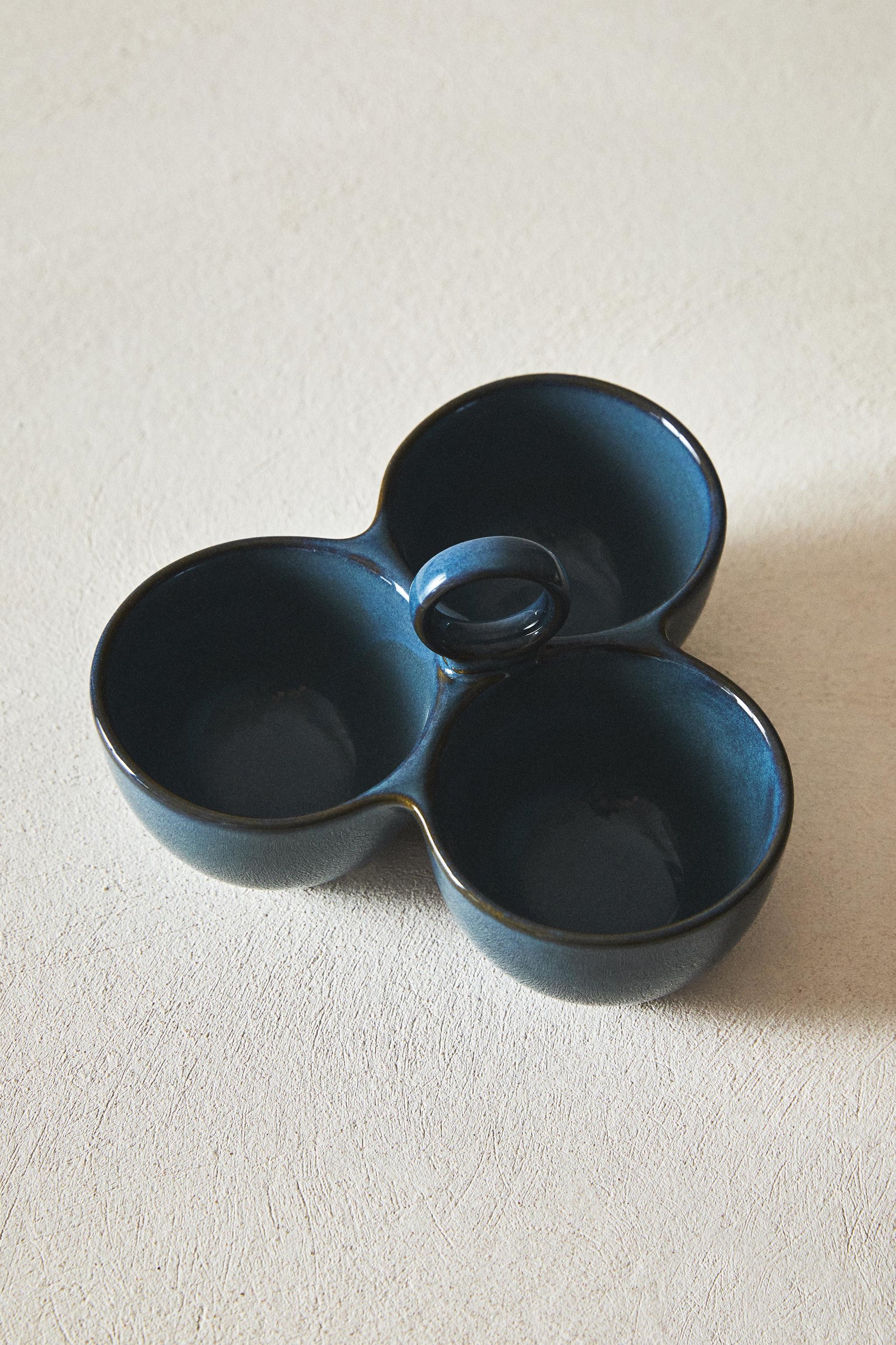 Triple stoneware snack bowl with a top handle in the center for easy transport. 3.5 x 6 x 6.4 " (Height x Width x Depth).