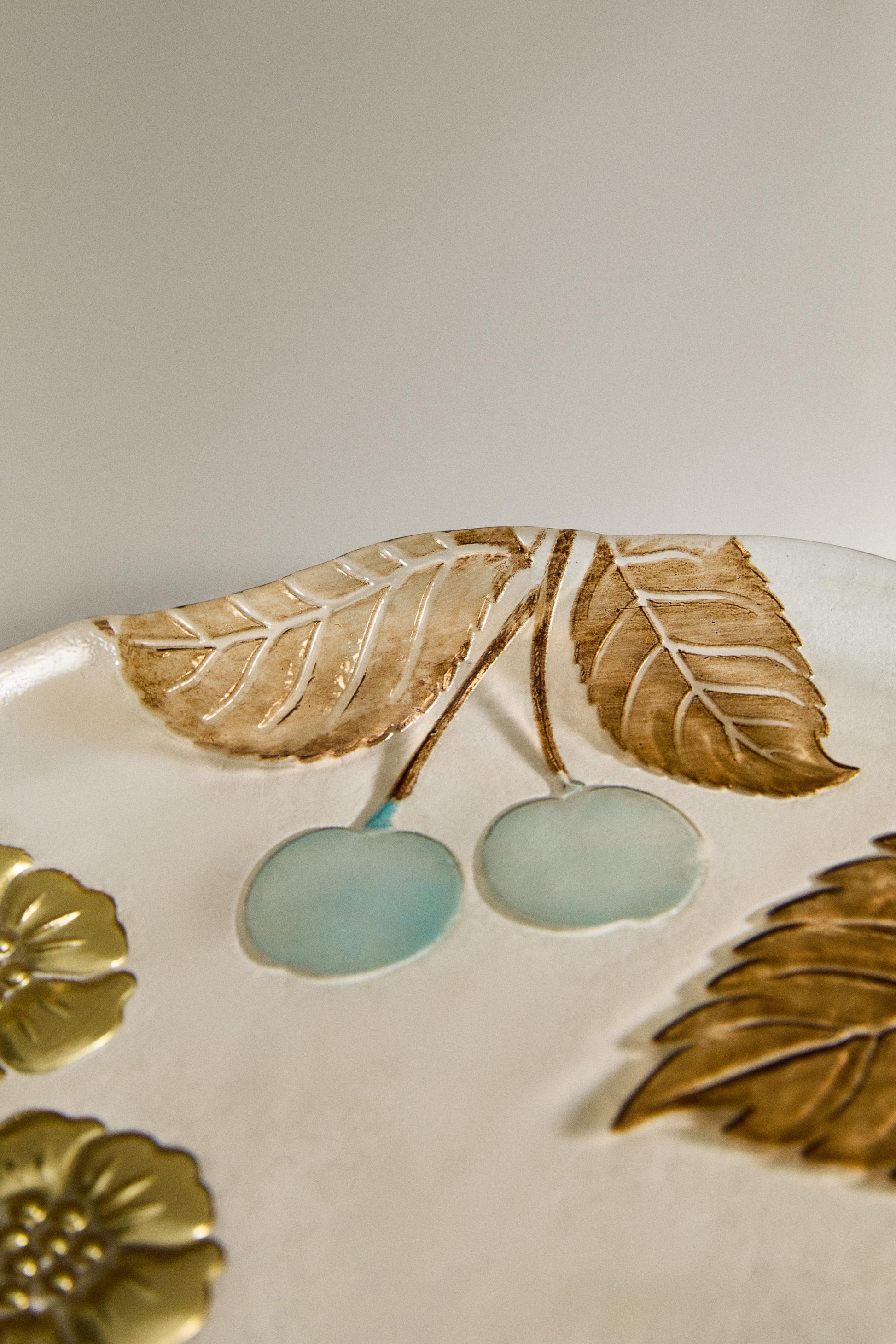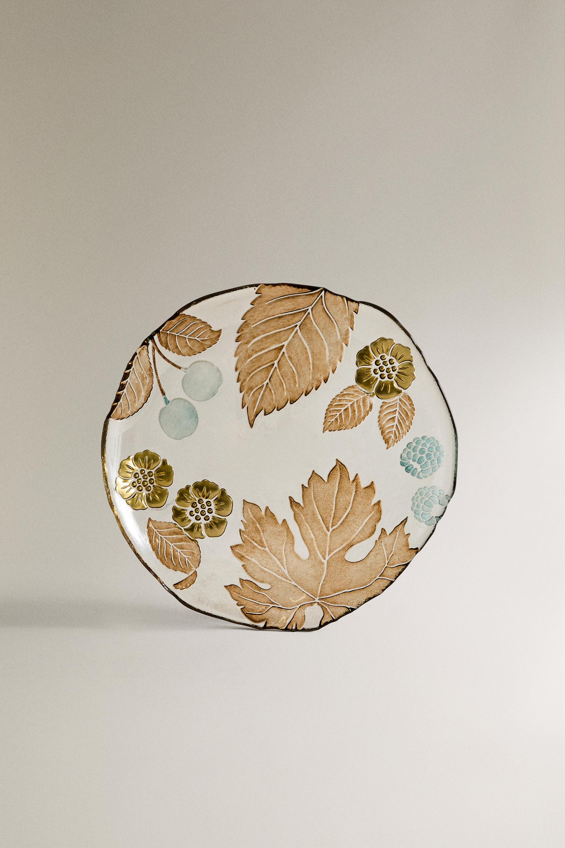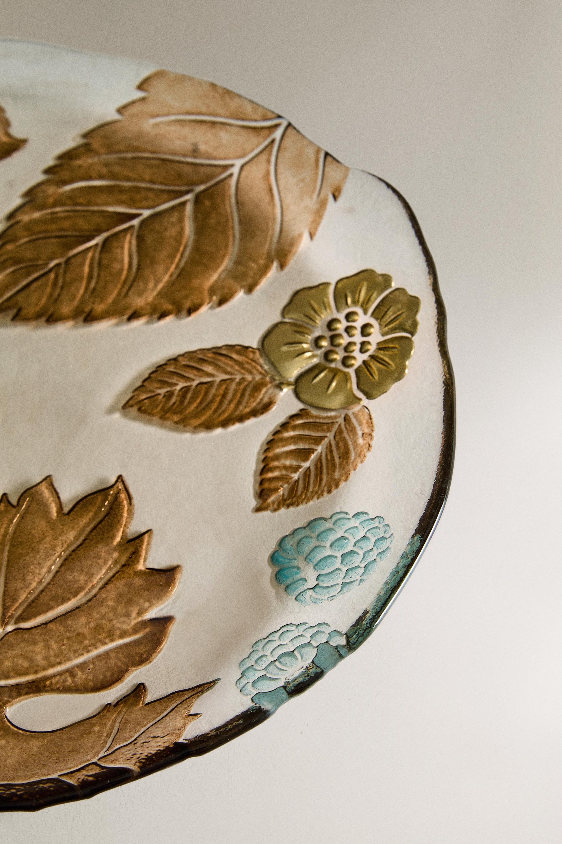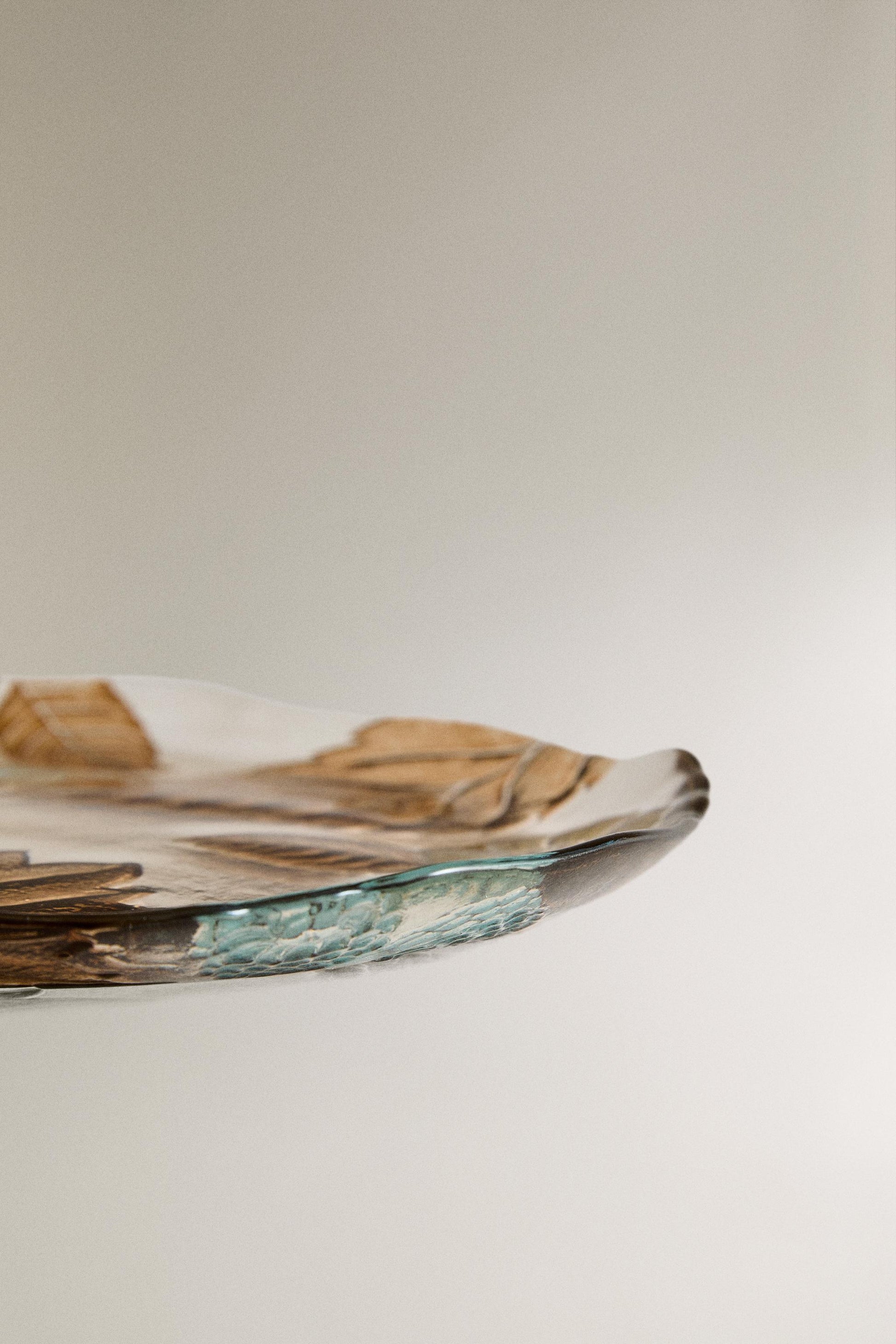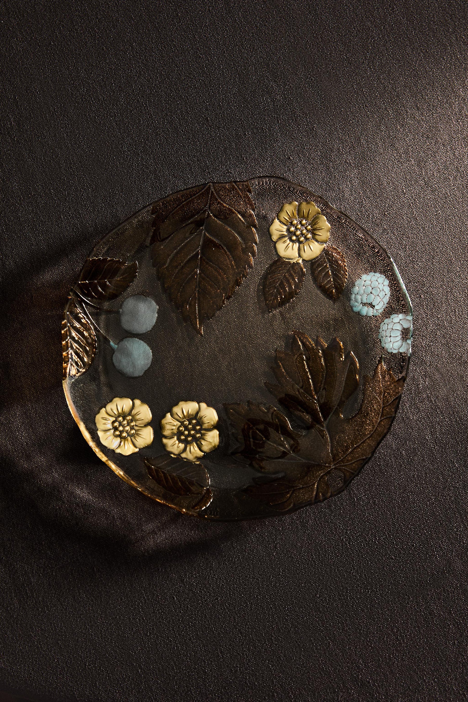 Glass dessert plate with a leaf, fruit and flower design. 0.8 x 8.3 x 8.3 " (Height x Width x Depth).