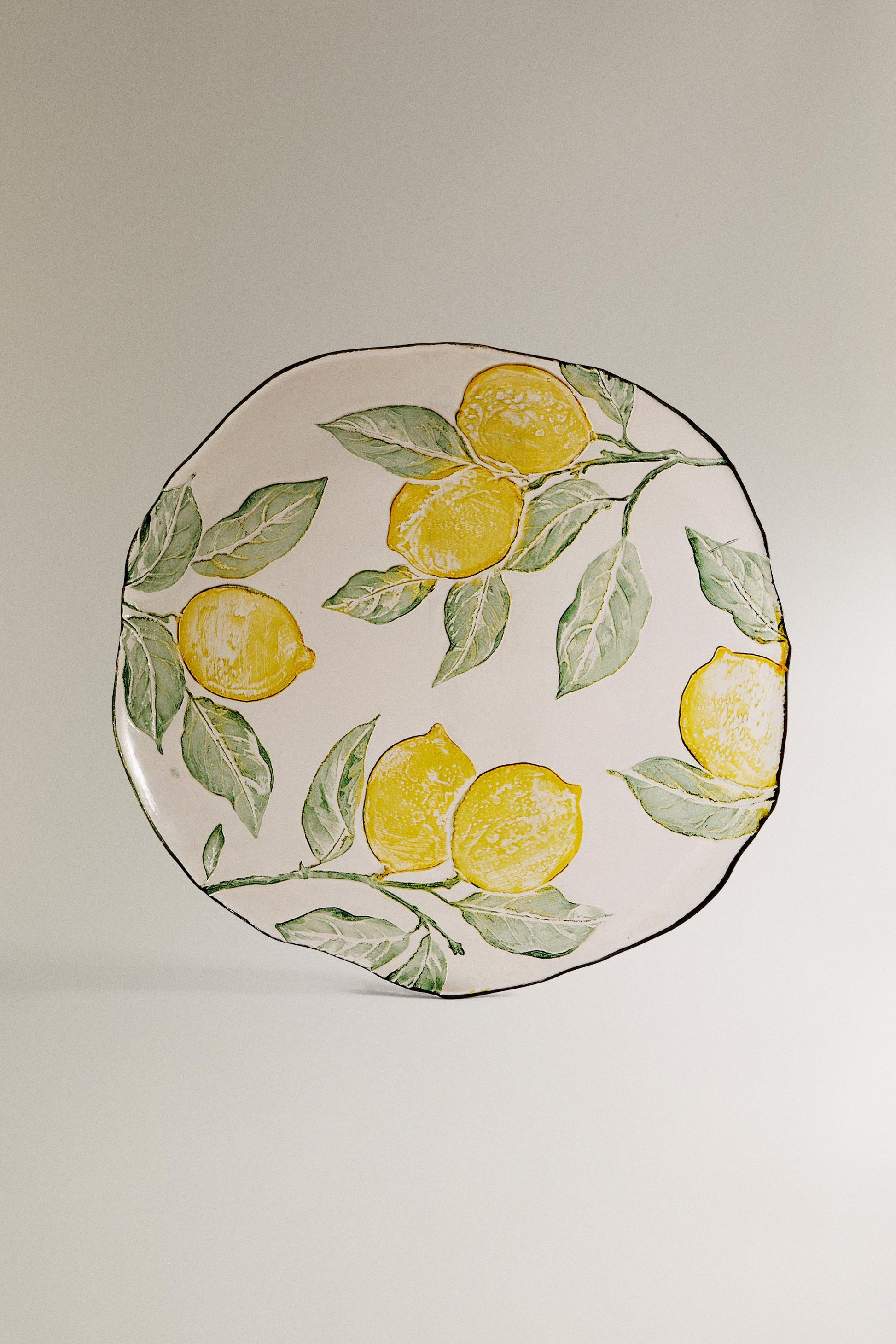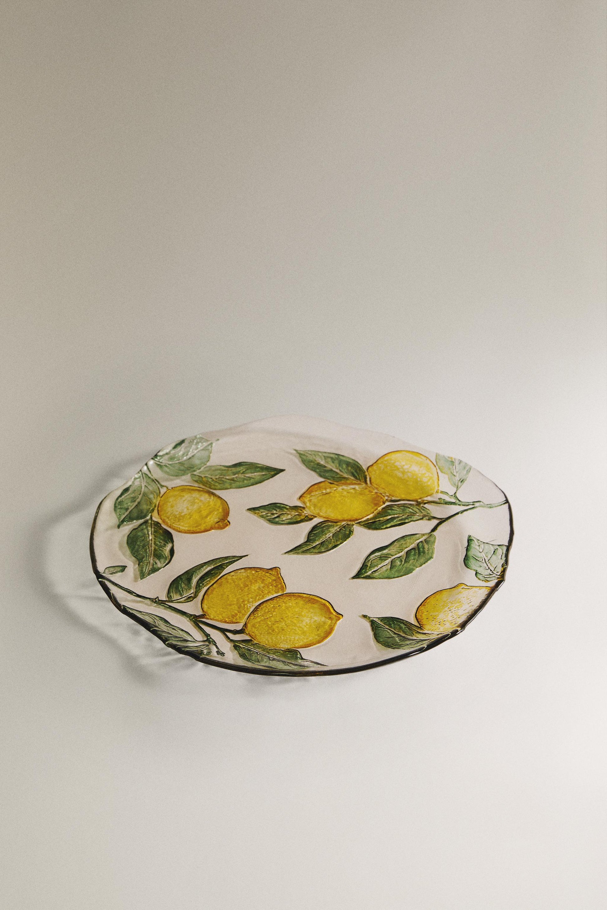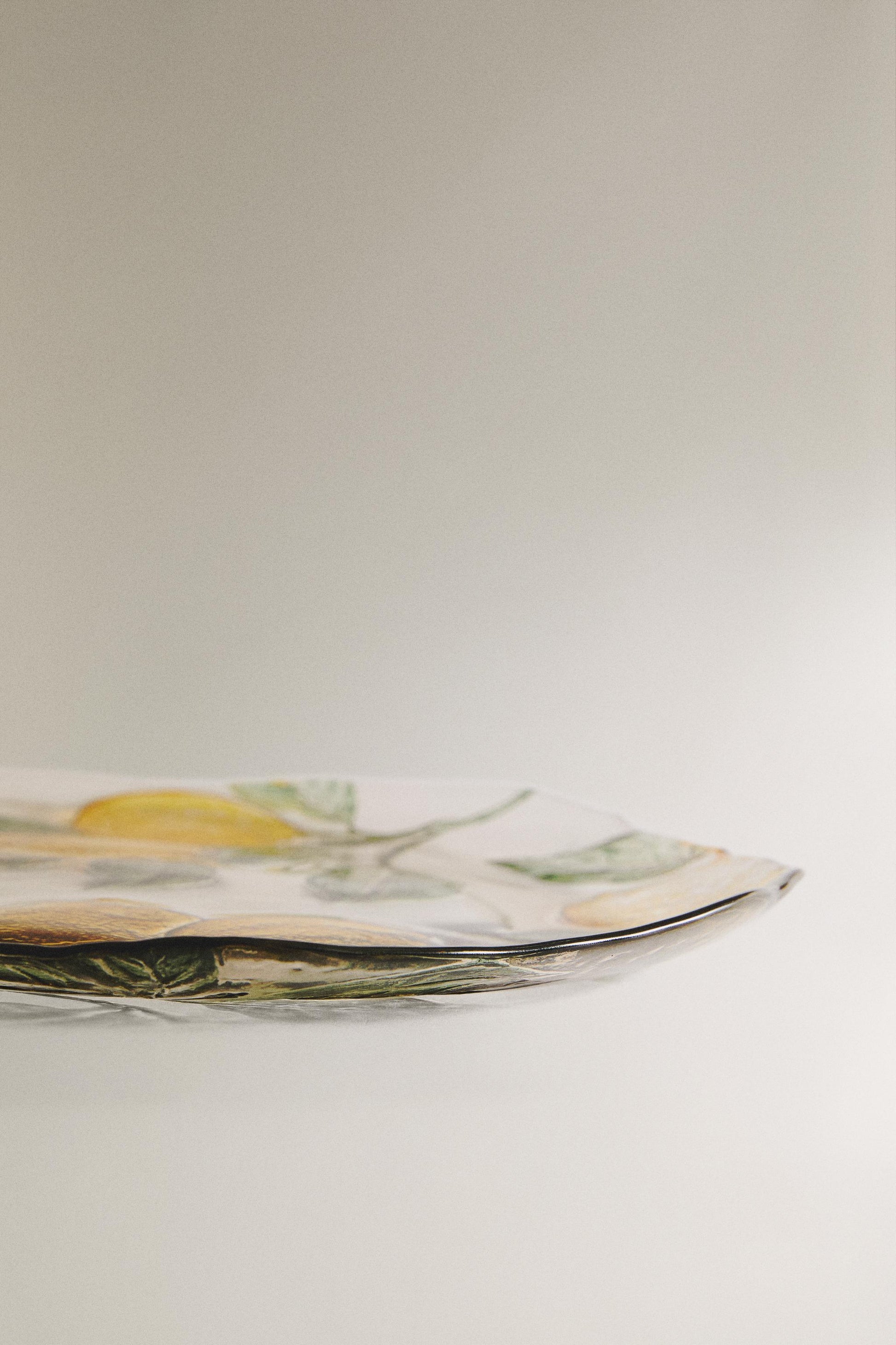 Glass dessert plate with a lemon tree branch design. 0.8 x 11 x 11 " (Height x Width x Depth).