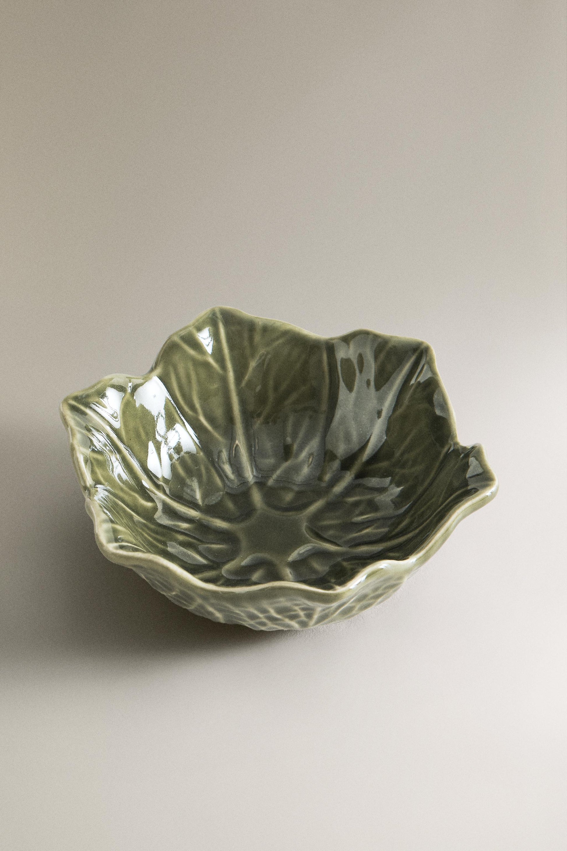 Stoneware side bowl with a cabbage leaf-shaped design. 6.1x2.2 in.