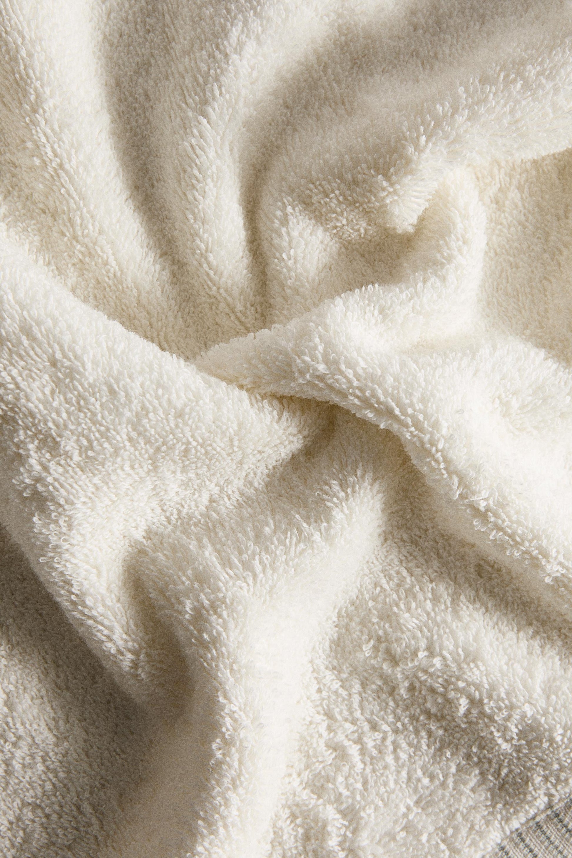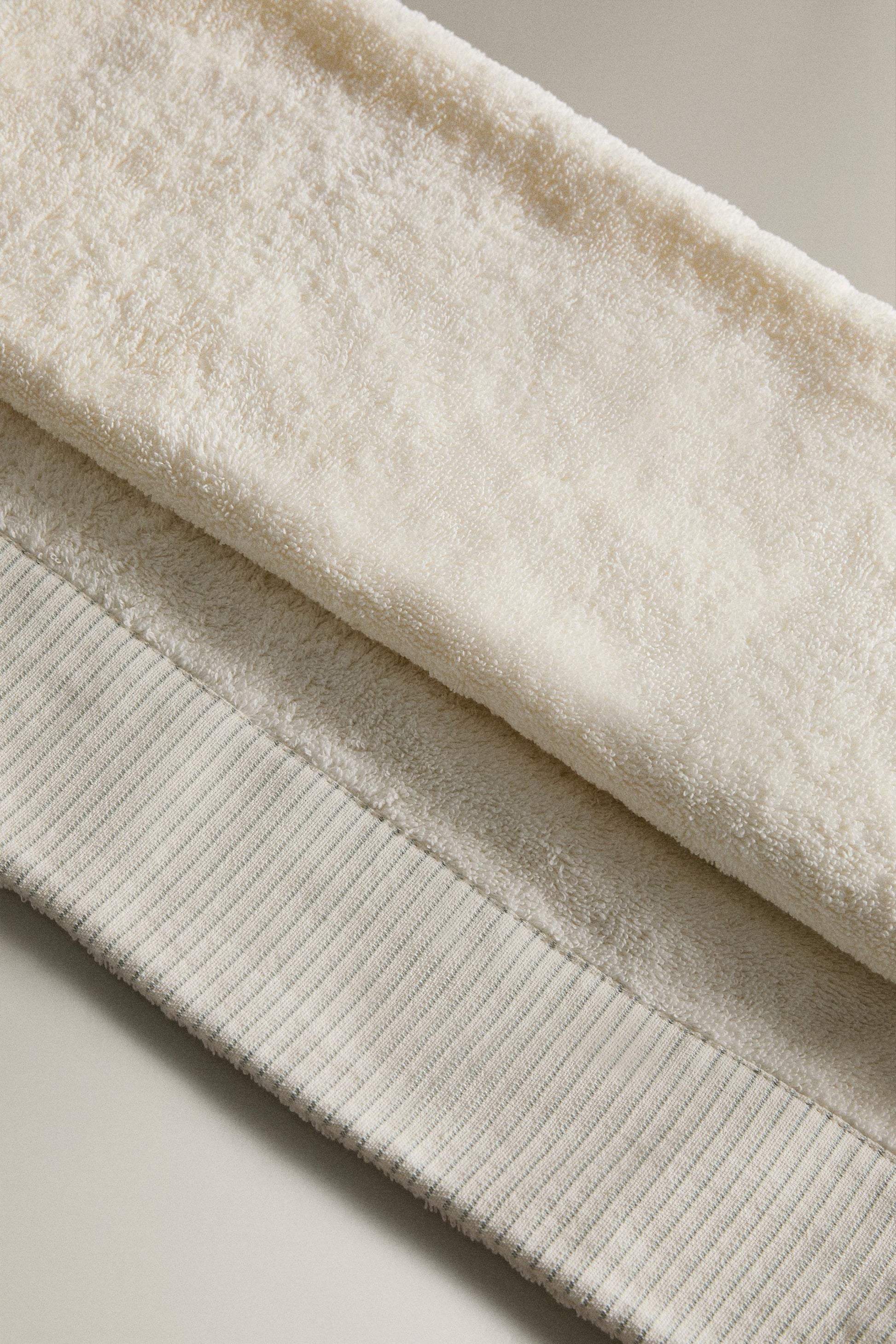 Cotton terrycloth towel with an applied striped border detail. Available in several sizes.