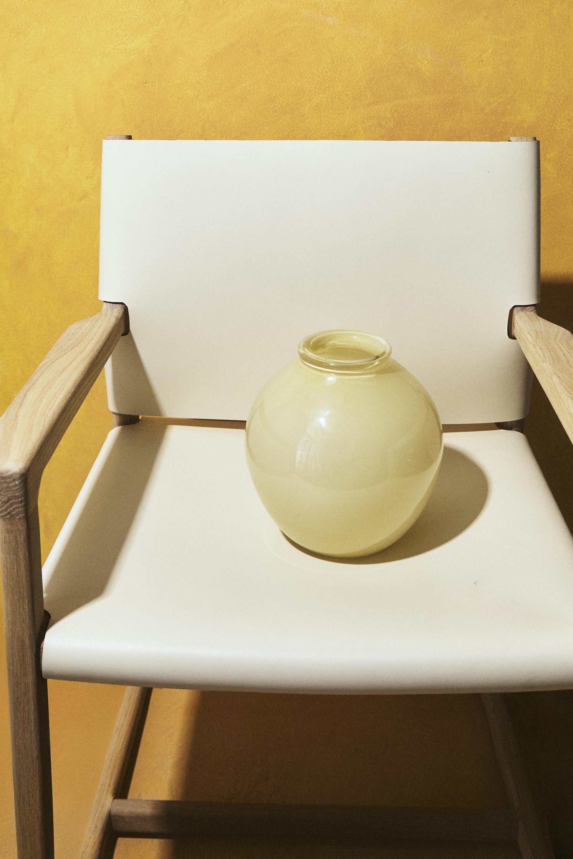 Vanilla glass vase in a round shape with wide curves and a narrower opening at the top. May be filled with water. Available in two sizes. Sold by unit.